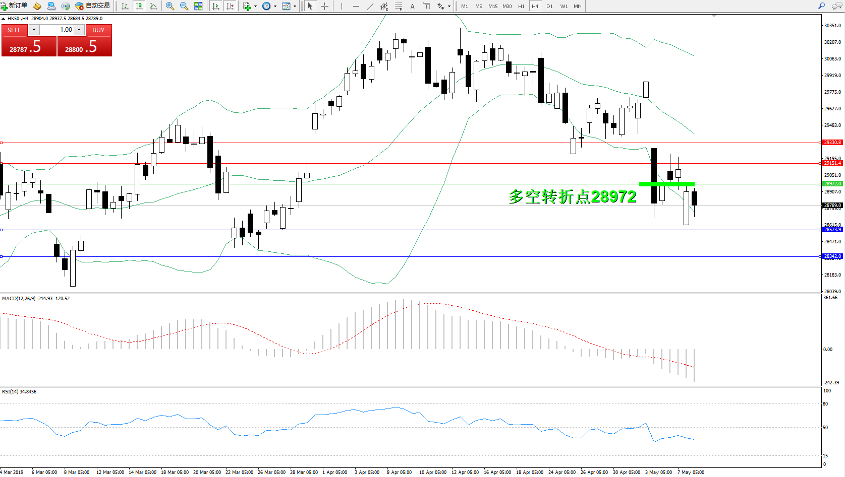 交易策略:28972下方看跌,目标28573、28342