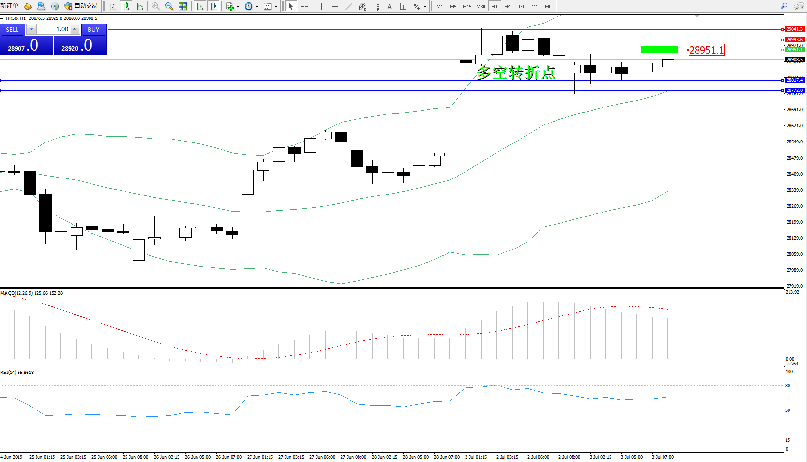 香港恒生指数7月3日(周三)收盘下跌20.42点,跌幅0.07%,报28855.14点;恒指窄幅震荡,如果没有再出现其他利好,短期可能难以补回29500以上的下跌裂口。G20峰会后中美贸易状况只是从前期的争端再次进入到谈判阶段。中美重启贸易磋商也部分影响此前市场对美联储减息步伐的预期。