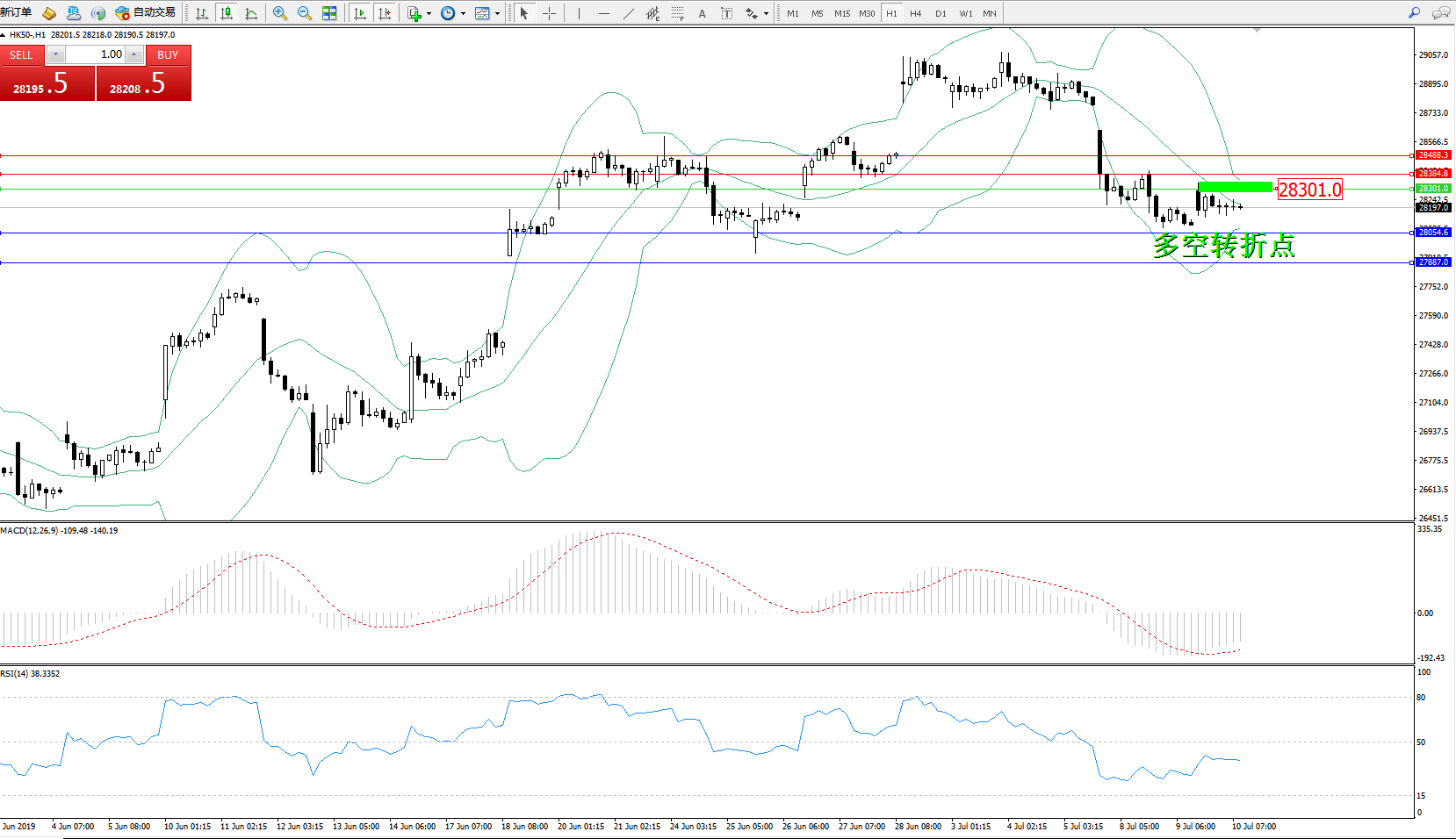 香港恒生指数7月10日(周三)收盘上涨88.41点,涨幅0.31%,报28204.69点;恒指今日向上的动力或依然不足,而且有很大概率会延续昨日表现,继续往下试探。美联储主席鲍威尔称:6月以来的不确定性持续打压经济前景。消费稳健,第二季度经济增速或将温和,贸易不确定性和对全球经济的担忧似乎继续拖累美国经济前景。鲍威尔暗示,市场认为美联储本月降息50个基点的概率上升至12.5%,降息25基点概率为87.5%,认为美国贸易政策的不确定性构成主要风险。