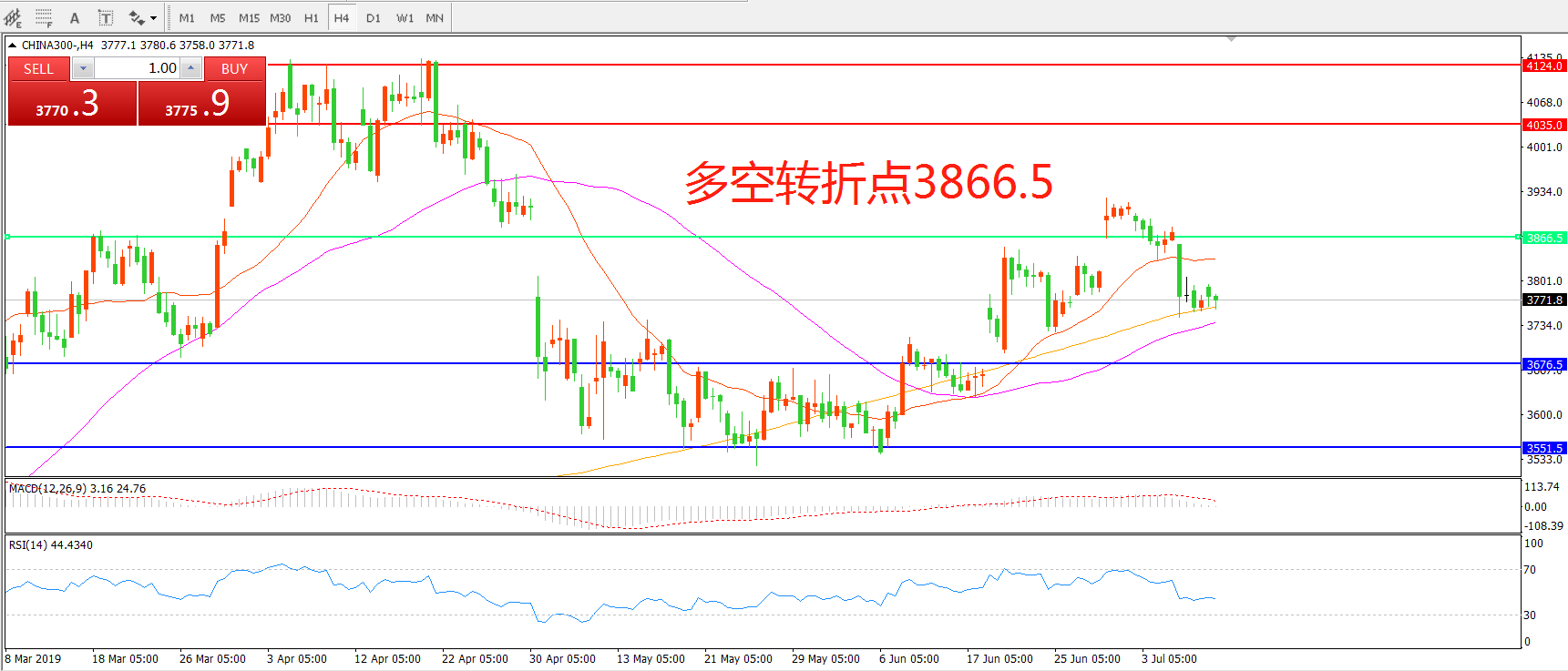 4小时图看,沪深300指数近期长阴下破后无力反弹,整体走势偏弱,但长期均线系统依然成为下方支撑,MACD红柱缩短,RSI指标走平,日内延续震荡概率较大。