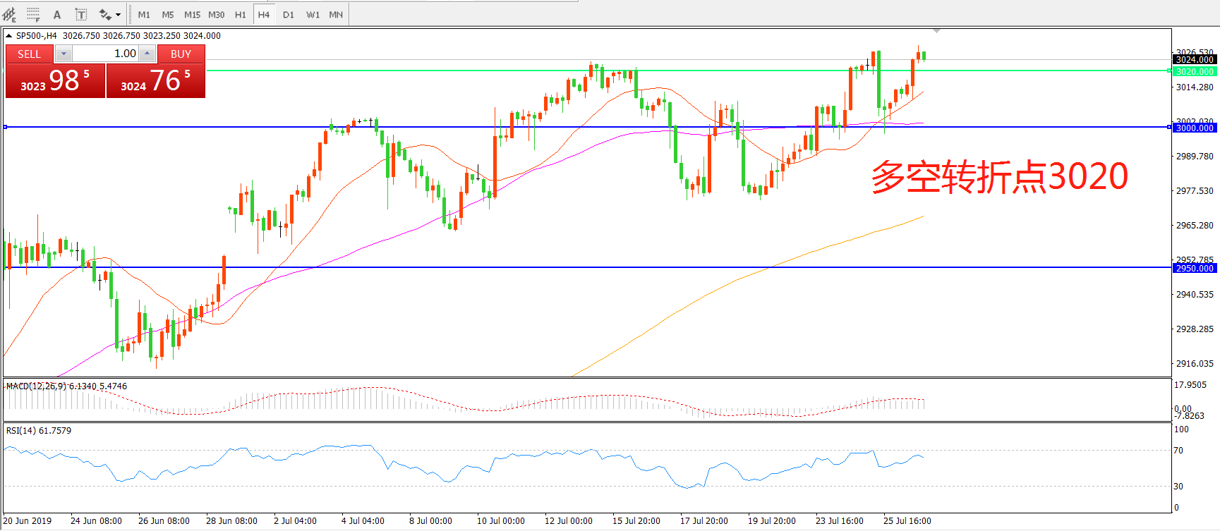 4小时图看,标普500以21周期均线为依托震荡上行,突破3020后表现依然强势,均线系统逐渐呈多头排列,MAC红柱增加,RSI指标走平,日内延续上行概率较大。