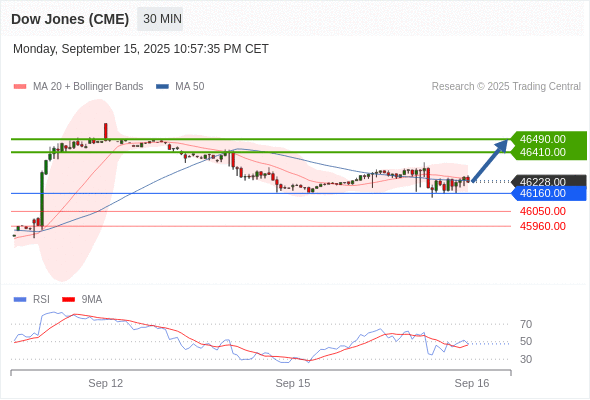 在 46160.00 之上,看涨,目标价位为 46410.00 ,然后为 46490.00 。