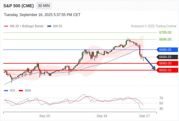 在 6680.00 之下,看跌,目标价位为 6660.00 ,然后为 6650.00 。