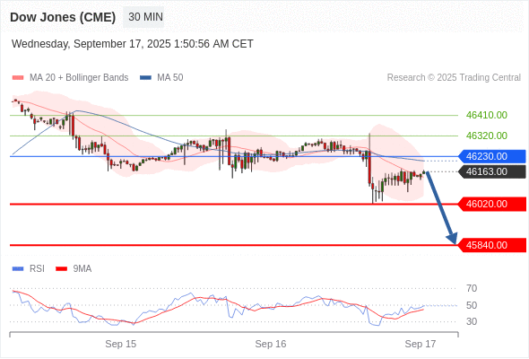 美国道琼斯指数期货 (Z5) 当日内: 短期关键阻力位在46230.00。