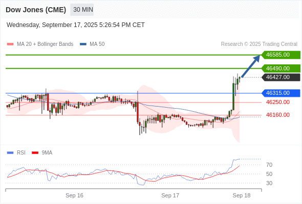 在 46315.00 之上,看涨,目标价位为 46490.00 ,然后为 46585.00 。