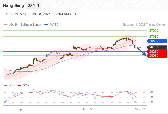 恒生指数 当日内: 存在压力。