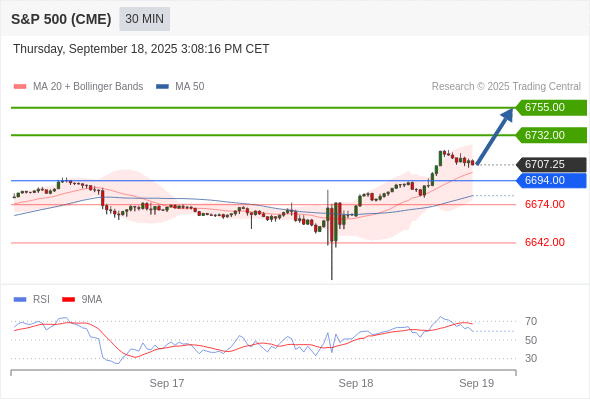 美国标普500指数期货 (Z5) 当日内: 超短线(当日内)支撑位在6694.00附近。
