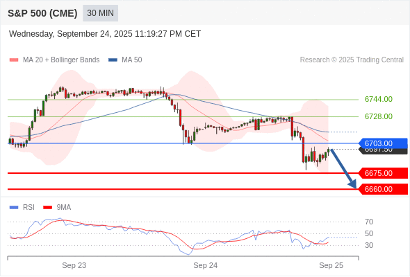在 6703.00 之下,看跌,目标价位为 6675.00 ,然后为 6660.00 。