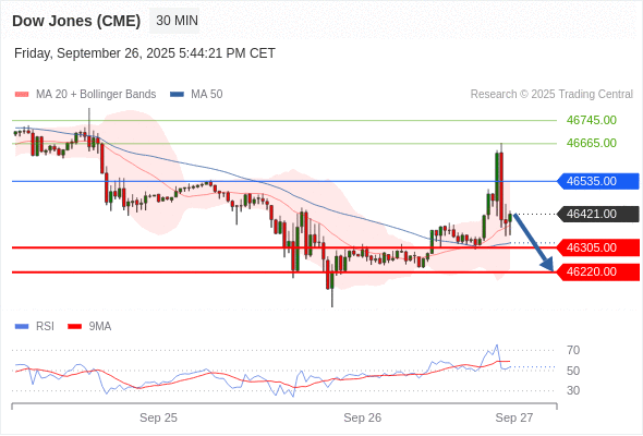 在 46535.00 之下,看跌,目标价位为 46305.00 ,然后为 46220.00 。
