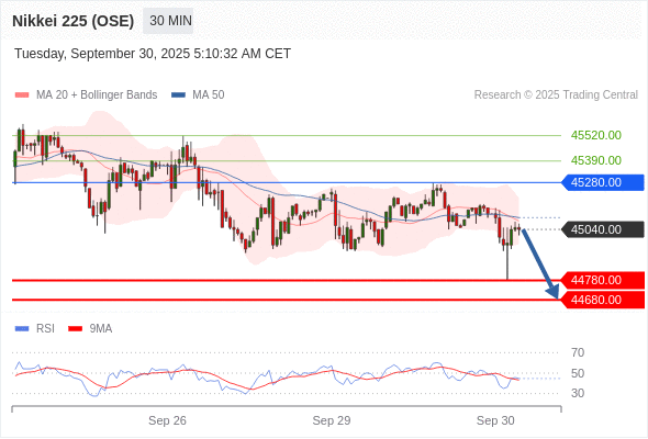 在 45280.00 之下,看跌,目标价位为 44780.00 ,然后为 44680.00 。