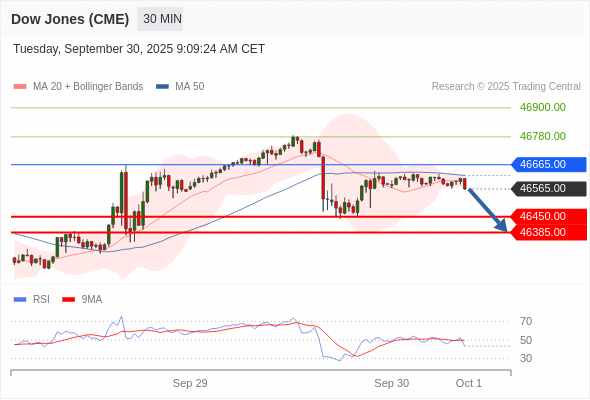 在 46665.00 之下,看跌,目标价位为 46450.00 ,然后为 46385.00 。