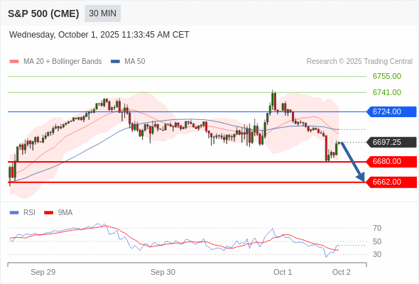 在 6724.00 之下,看跌,目标价位为 6680.00 ,然后为 6662.00 。