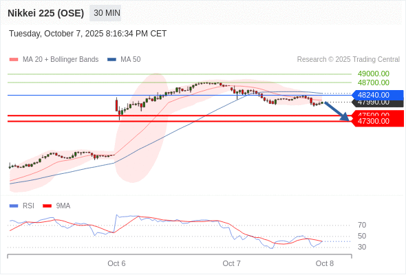 在 48240.00 之下,看跌,目标价位为 47500.00 ,然后为 47300.00 。