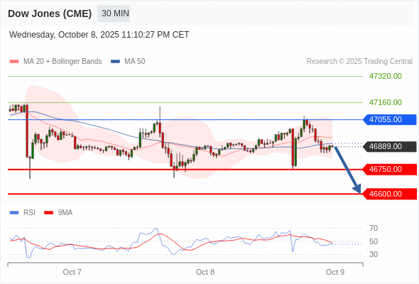 在 47055.00 之下,看跌,目标价位为 46750.00 ,然后为 46660.00 。