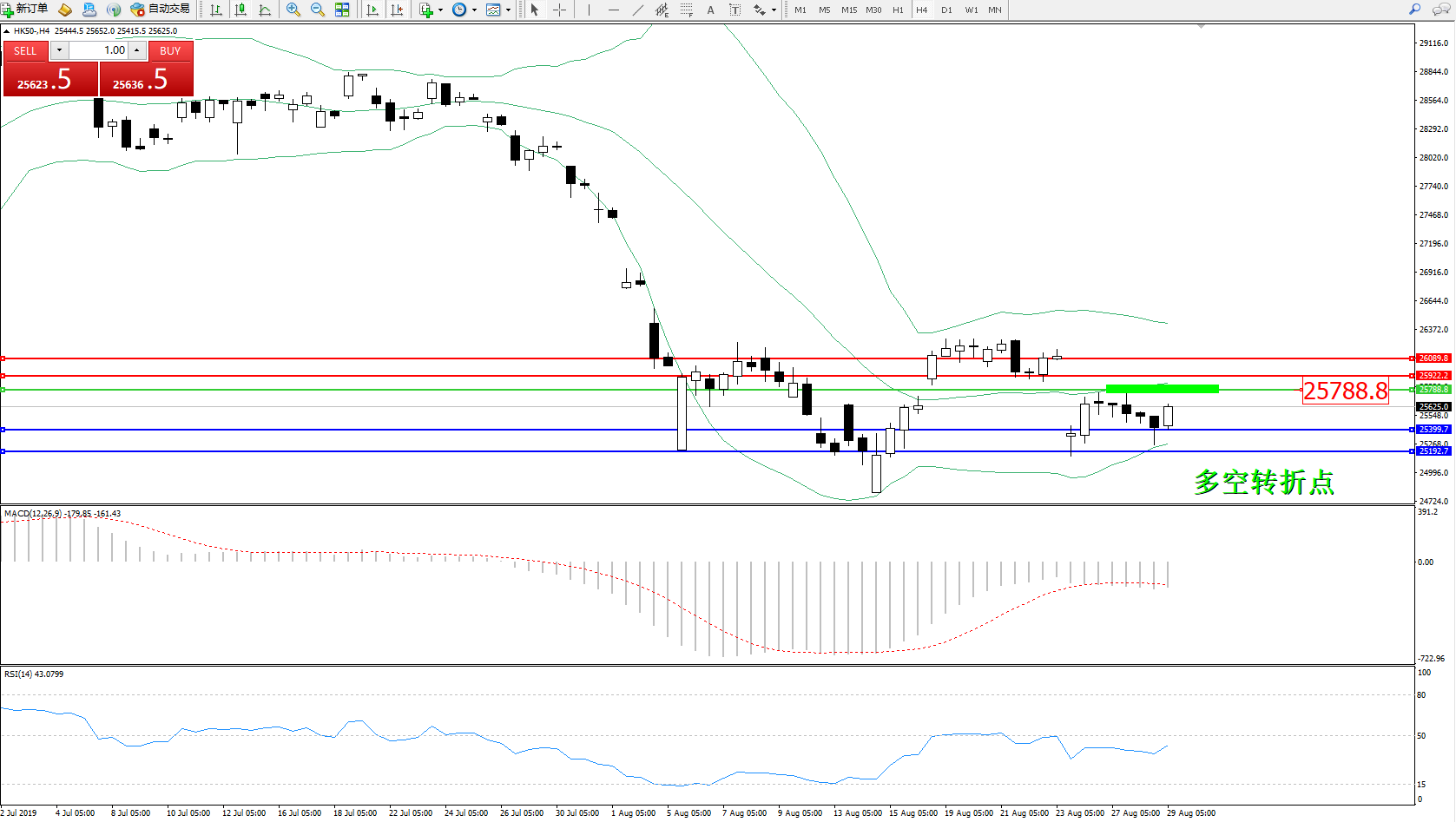 香港恒生指数829日(周四)收盘上涨88.02点,涨幅0.34%,报25703.50点;近日从各地之数据中显示,目前全球经济持续向下,更未见触低反弹。国内外之订单皆大幅下降。德国 PMI 更低见43.8。可见全球贸易跌幅比2012年还要差。连同美国债券息率日创新低,孳息率倒挂差距之幅度,也创出历史底位。此刻,相信在任何投资上,都要谨慎和保守。港股昨日高开后随即回落,其后于25600-25700点水平上落。多重因素继续困扰投资气氛。面对如此胶着状况,相信大市仍会呈窄幅上落,并于25500点水平拉锯。不过基于投资者关注内地经济以及未来净息差表现,股价实在难有憧憬,故建议继续观望为上。