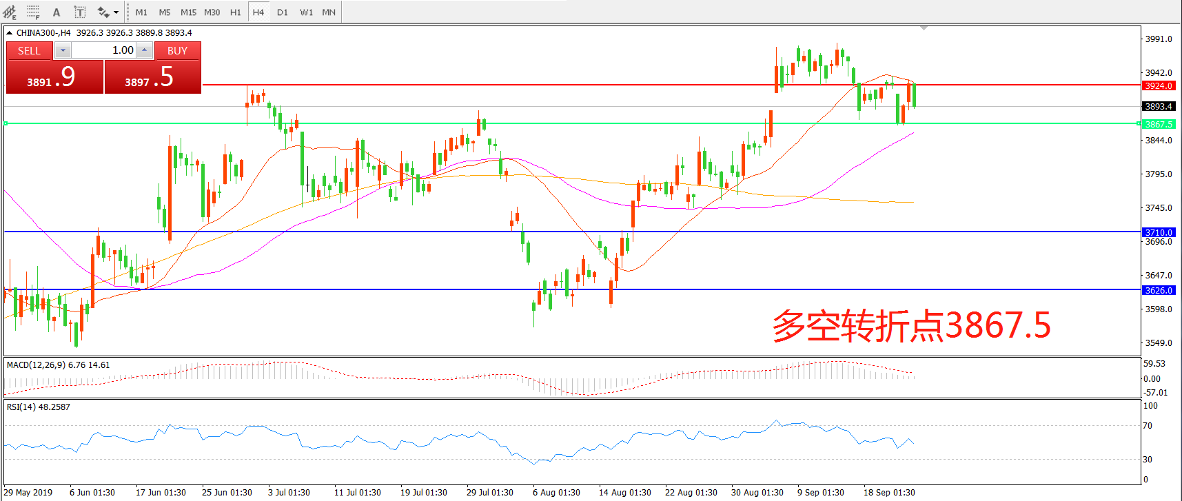 4小时图看,沪深300延续高位震荡,3924成为上方阻力,3867.5成为下方支撑,MACD红柱减少,RSI指标向下,日内依然有回落风险,但中期走势偏多。