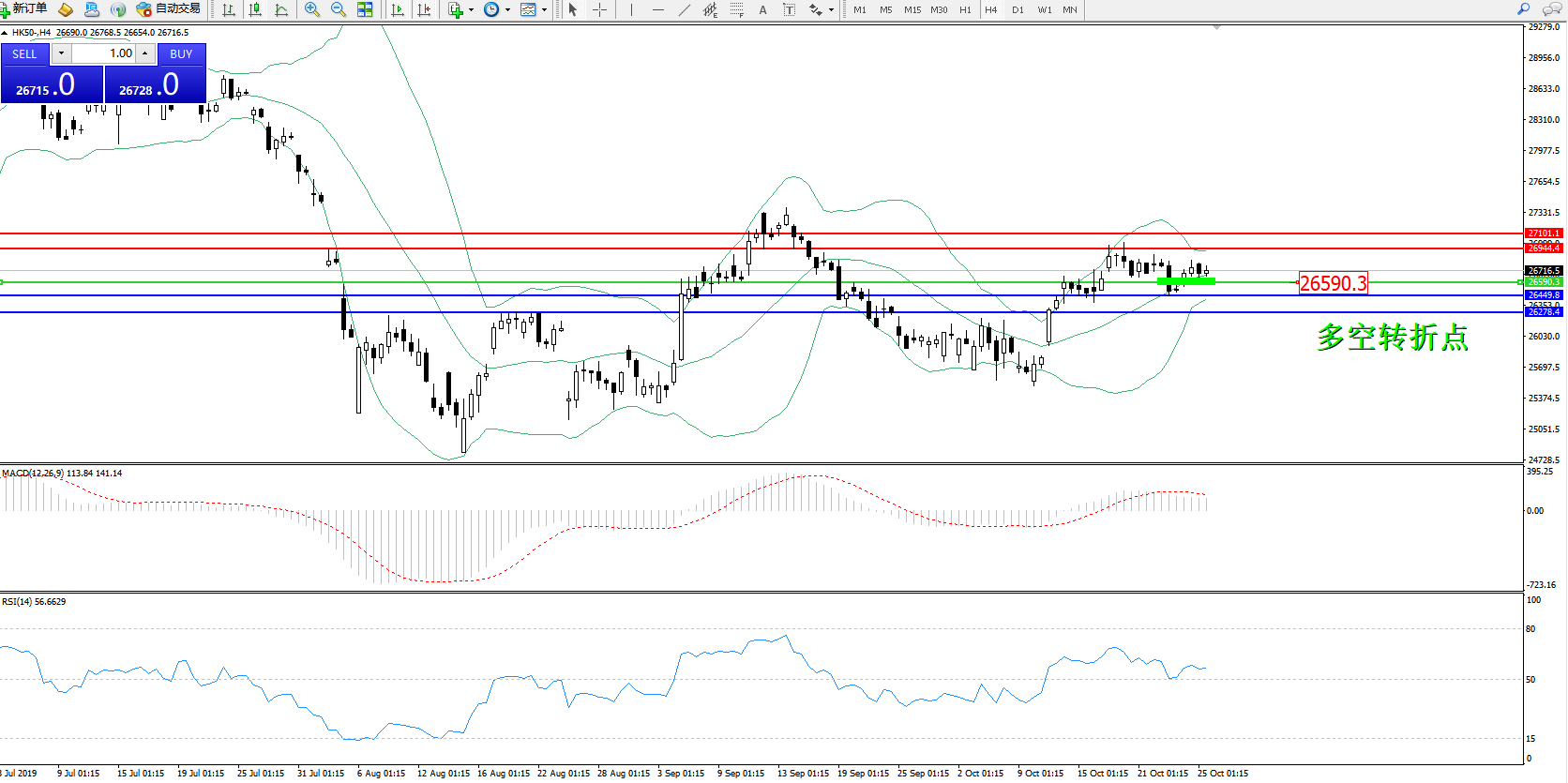 香港恒生指数10月25日(周五)收盘下跌130.56点,跌幅0.49%,报26667.39点;港股小幅低开,随后沽压呈现扩大跌幅,恒指低见26621,香港统计局昨日公布9月份出入口数据。出口连续第11个月下跌,跌幅7.3%。多过预期跌7%。市场继续观望英国脱欧进展。同时,美联储下周的议息会议也备受关注。即将离任的欧洲央行行长德拉吉强调宽松政策与经济下行风险。有媒体报道,高盛预期美联储将会一如预期在下周宣布降息,同时会作出两大关键转变,可能会触动市场情绪。