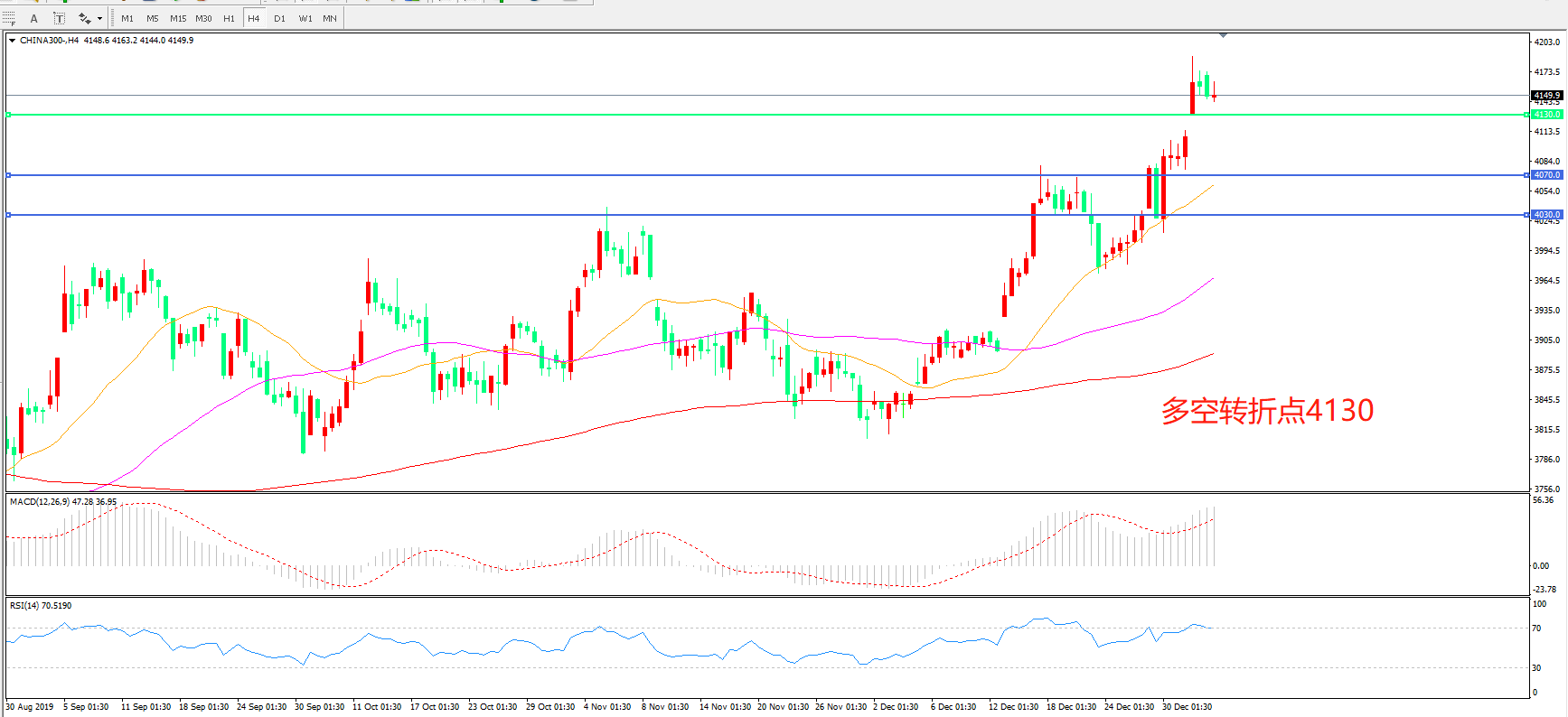 4小时图看,沪深300高开高走,突破4130阻力,随后虽稍有回落,但整体表现十分强势,均线系统呈多头排列,MACD红柱增加,RSI指标走平,日内延续上行概率较大。