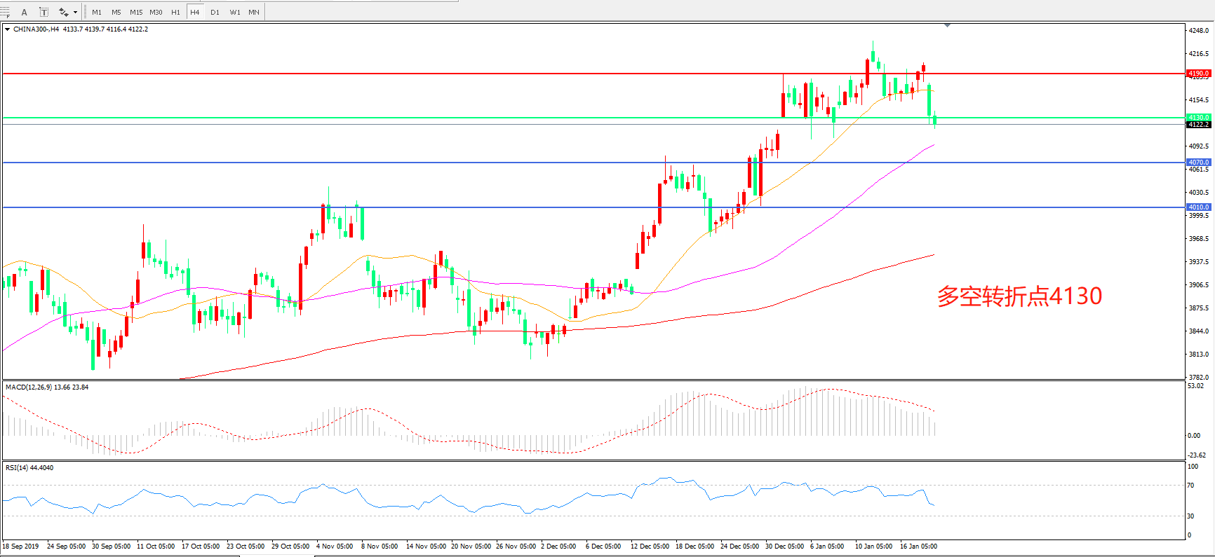 4小时图看, 沪深300长阴下破,短期涨势受挫,均线系统呈多头排列,MACD红柱减少,RSI指标走平,日内震荡上行概率较大。