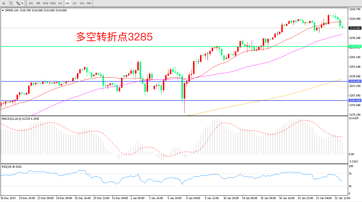 4小时图看,标普500冲高回落涨势受阻,均线系统有拐头迹象MACD红柱减少RSI指标向下,日内延续震荡概率较大。