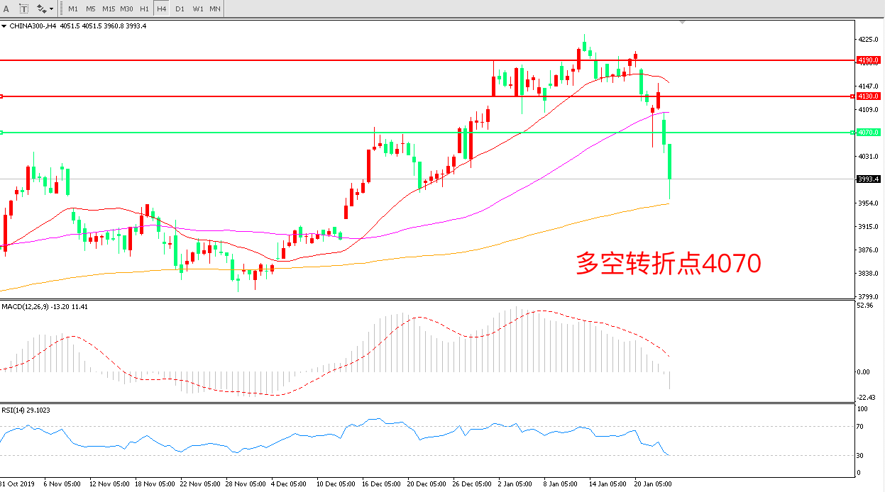 4小时图看, 沪深300长阴下破,整体涨势被破坏,23日节前最后一个交易日,节后关注是否有跳空,再行定夺。
