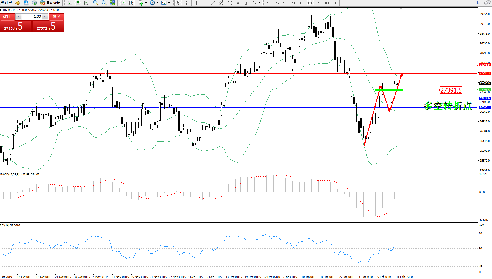 香港恒生指数2月11日(周二)收盘上涨342.54点,涨幅1.26%,报27583.88点;港股市场集体强势,主要股指皆大涨超1.2%。受隔夜美股再创新高影响,早盘主要股指皆大幅高开,全日维持高位震荡上扬。物管股、餐饮股集体爆发 腾讯升超2%,国指更是一度冲高近2%。市场板块轮动明显,前期火爆的在线科技股都有回落。主板全日成交1110.15亿港元,港股通净流入48.59亿港元。全球景气周期可能逐步见底,流动性整体仍然宽松,资金流入股市的趋势仍在继续,市场整体估值并不高,港股估值相对更具吸引力。随着疫情得到有效抑制,同时有托底政策持续加码,再叠加外资、银行理财、保险养老金等中长期资金持续流入,市场将很快重新进入上行轨道。