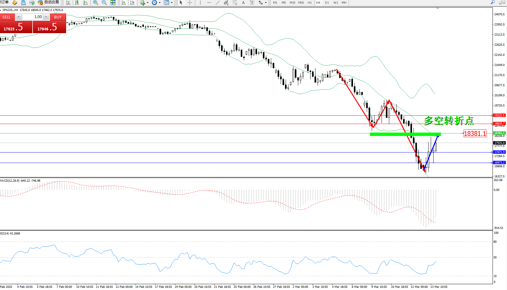 日经225指数3月13日(周五)收盘下跌1117.13点,跌幅6.02%,报17442.50点。日内全球金融市场恐慌情绪有所降温,更多央行加入到宽松行动中来,同时多国也表示进一步的维稳经济,日本央行进行计划外公开市场操作,为证券方面提供1.5万亿日元的流动性,并招标买入2000亿日元的日本债券;这是为了抑制收益率上升,并为市场提供流动性,在黑田东彦表示日本央行将毫不犹豫采取行动后,杠杆资金对美元兑日元空头回补。在欧洲交易时段,报道称日本央行下周会议上可能扩大刺激措施,旨在限制疫情的打击并安抚波动的市场。