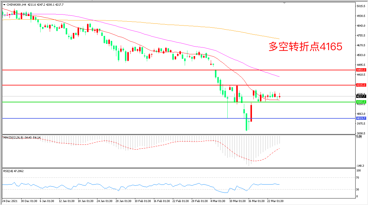 4小时图看,沪深300以4165为依托展开整理,短期波幅不大, MACD绿柱缩短,RSI指标走平,日内延续震荡概率较大。
