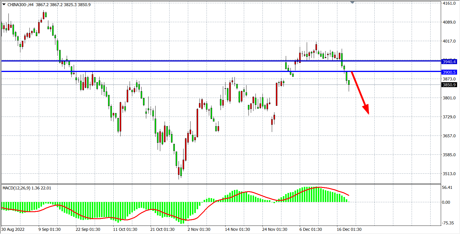 4小时图看,沪深在3940之下持续下跌,且再度跌破3900,趋势呈空头下行,MACD于零轴之下出现持续放量状态,显示行情进一步走空,当前强支撑3900已转化为压力,在3900之下看空为主,下方看3800-3750附近。