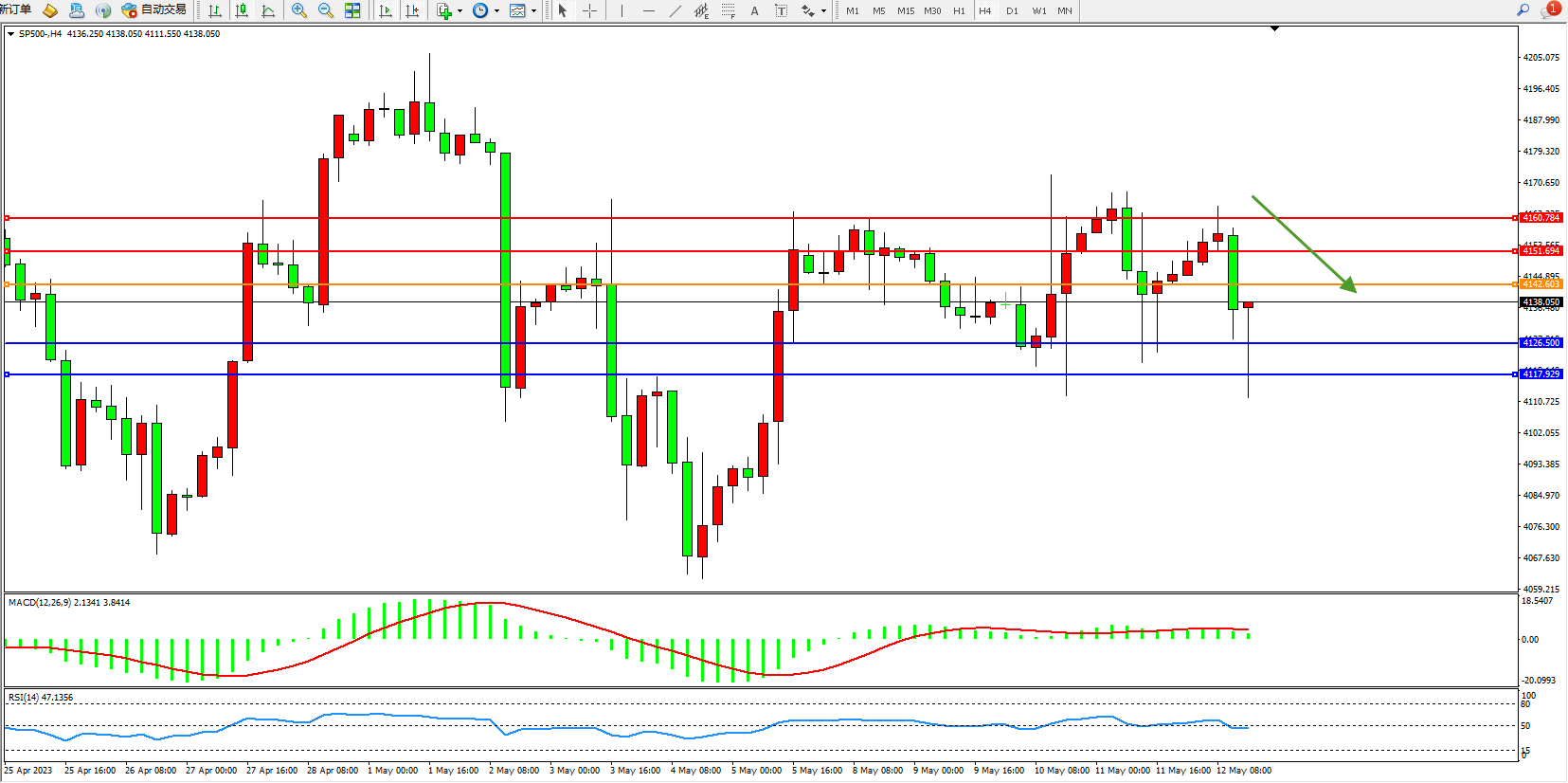 标普500指数5月12日(周五)收盘下跌6.04点,跌幅0.15%,报4124.58点;美国消费者信心5月下滑至六个月低点,因为他们担心关于提高联邦政府借款上限的政治角力可能引发经济衰退。消费者的长期通胀预期本月跃升至2011年以来的最高水平,这对美联储来说是个坏消息,联储上周暗示可能暂停自1980年代以来最快的货币政策收紧周期。