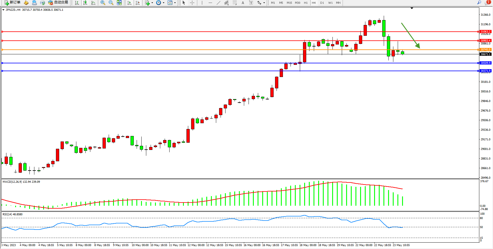 日经225指数5月23日(周二)收盘下跌109.32点,跌幅0.35%,报30977.50点。2022财年日本经通胀调整后的实质薪资降幅为八年来最大,因为生活成本的上升超过了名义薪资的上涨。在截至3月的上一财年,名义薪资增长了1.9%,是31年来的最快增速,但低于3.8%的通胀率,导致2022财年实质薪资下降了1.8%。