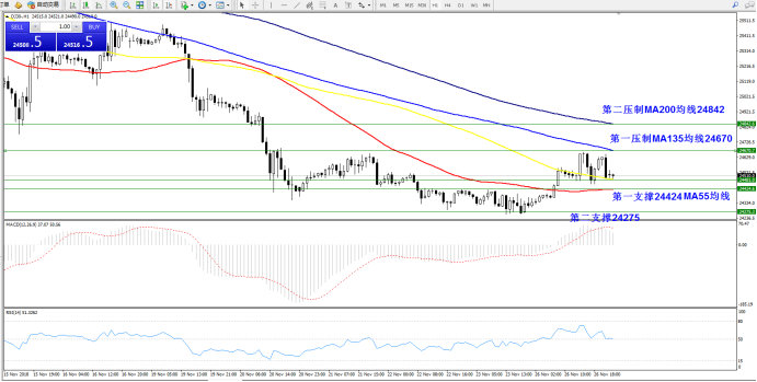 技术点评:小时周期图显示第一压制位于MA135均线24670附近,第二压制MA200均线24842附近,第一支撑MA55均线24424附近,第二支撑24275附近,MACD指标多头出现疲惫,RSI指标已经回归50均衡线附近平移。