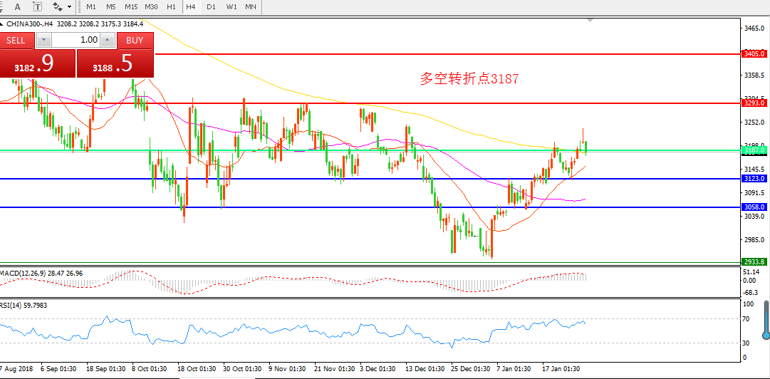 4小时图看,CHINA300中华指数经过连续整理突破并站稳200周期均线,虽然昨日下行调整,但整体依然在多空转折点智商,短期均线逐渐拐头, MACD红柱减少,暂时仍保持偏多思路。