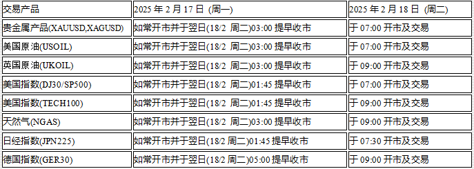 因应美国总统日假期 (2025年2月17日 周一),本公司以下产品的交易时间将于假期期间作以下安排,敬请留意。