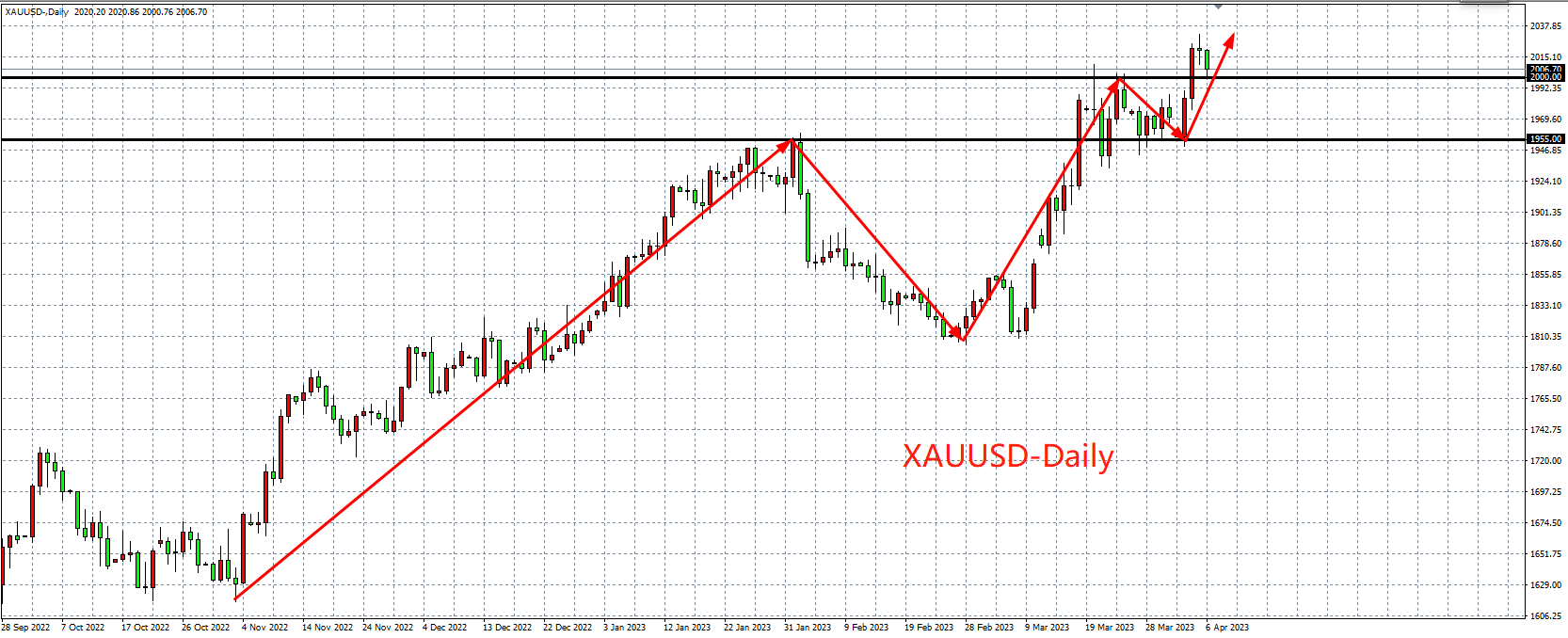周一(4月3日),在欧佩克+成员国意外减产重燃市场对长期通胀的担忧并引发对美联储反应的不确定性后 ,美指一度冲高,但随着公布的美国ISM公布的数据不及预期,经济衰退担忧重燃,美指回吐全部涨幅。黄金在欧佩克+减产后自低位1950美元大幅反弹40美元至1990美元水平,凸显市场避险情绪仍挥之不去,欧佩克+减产对市场的负面情绪开始反馈,金价大趋势不变,上涨仍是主旋律。