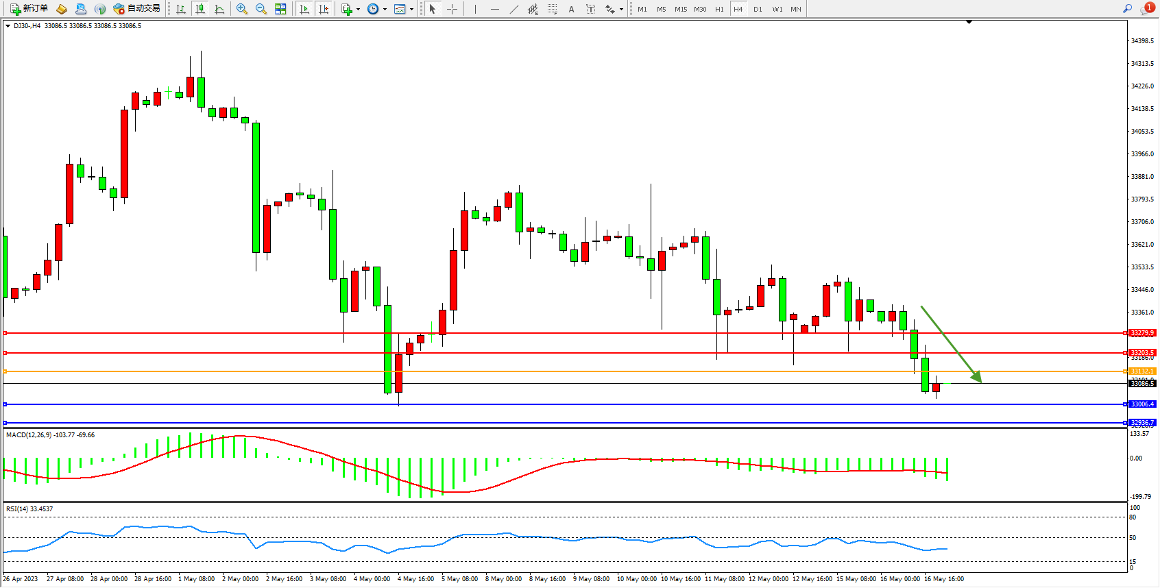 道琼斯指数5月16日(周二)收盘下跌336.26点,跌幅1.01%,报33012.34点;美国4月零售销售增幅低于预期,但基本趋势稳健,暗示消费者支出可能在第二季初保持强劲,尽管今年经济衰退的风险日益加大。